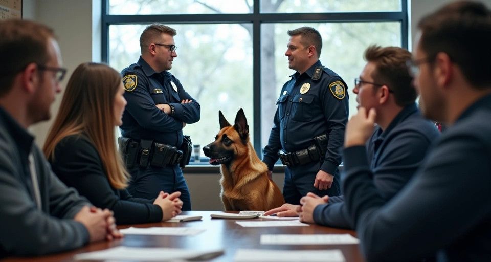 Na komisariacie we Wrzeszczu gościli studenci kierunku Bezpieczeństwo wewnętrzne Wyższej Szkoły Bezpieczeństwa w ramach zajęć terenowych z przedmiotu Kryminologia z elementami kryminalistyki. Przewodnik psa służbowego przybliżył metody pracy z psem tropiącym zwłoki.