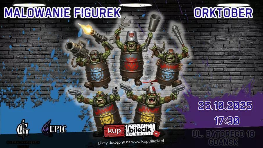 Malowanie Figurek: Od Pierwszego Pociągnięcia po Arcydzieło! Gotowi, by zanurzyć się w świat miniaturowej sztuki i dać upust swojej kreatywności W naszym studio każdy znajdzie coś dla siebie - niezależnie od tego, czy pędzel trzymasz po raz pierwszy, czy jesteś już weteranem bitewnych dioram! Co najważniejsze, o wszystko zadbamy my! Organizator zapewnia wszelkie materiały do malowania oraz figurki - Ty przynosisz tylko dobry humor i chęć do zabawy! Warsztaty Podstawowe: Dla Początkujących Bohaterów Pędzla! Nigdy nie malowałeś figurek A może Twoje ostatnie dzieło to laurka dla babci w przedszkolu Idealnie! Na naszych warsztatach podstawowych wprowadzimy Cię w magiczny świat farb i detali. Krok po kroku pokażemy, jak tchnąć życie w miniaturowe postacie, a Ty wyjdziesz z własnym, dumnie pomalowanym dziełem. Zero stresu, maksimum frajdy i gwarantowane "wow!" od znajomych! Warsztaty Zaawansowane: Gdy Pędzel Staje się Przedłużeniem Duszy! Dla tych, którzy już nie boją się cieniowania, blendowania i technik NMM (Non-Metallic Metal - tak, to prawdziwa magia!). Jeśli czujesz, że Twoje figurki potrzebują "tego czegoś", a Ty chcesz podnieść swoje umiejętności na epicki poziom, te warsztaty są dla Ciebie! Będziemy eksplorować zaawansowane techniki, eksperymentować z kolorami i sprawiać, że Twoje miniatury będą wyglądać jak z okładki magazynu. Przygotuj się na wyzwania i satysfakcję z perfekcji! Okolicznościowe Malowanie Figurek: Świętuj z Pędzlem w Dłoni! Walentynki z figurką zakochanego gnoma Orktober z krwiożerczym orkiem A może świąteczny elf z brokatem U nas każda okazja jest dobra, by chwycić za pędzel! Organizujemy tematyczne sesje malarskie, które idealnie wpisują się w kalendarz świąt i nietypowych wydarzeń. To doskonały pomysł na oryginalne spędzenie czasu z przyjaciółmi, rodziną czy drugą połówką. Dużo śmiechu, unikalne figurki i niezapomniane wspomnienia gwarantowane! Dołącz do nas i odkryj swoją artystyczną stronę - pędzle czekają! Bilety do nabycia na: