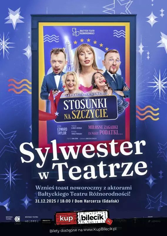 Spędź wyjątkową noc sylwestrową w Domu Harcerza w Gdańsku (dawne kino Watra) i i baw się przy znakomitej farsie "Stosunki na szczycie" - pełnej humoru, zabawnych pomyłek i komicznych zwrotów akcji. Nie zabraknie także wspólnego toastu noworocznego w towarzystwie aktorów - razem powitamy nadchodzący rok w atmosferze radości i śmiechu.