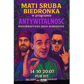 | ANTYWITALNOŚĆdodano 2025-09-30 19:14:38 Zaprezentuje program "ANTYWITALNOŚĆ". Spodziewajcie się żartów, gagów, pogadanek przecinanych bitem i samplem ostrym jak brzytew. Historia trzech mężczyzn na drodze do oświecenia odsłoni karty wtajemniczenia "jak być lamusem by mieli cię za kozaka". Trio komediowo-muzyczne w składzie: Stand-up: Mati, Śruba, Biedronka artyści: Stefan Biedronka, Mateusz Kiedrowski, Filip Śruba GoździewskiZaprezentuje program "ANTYWITALNOŚĆ". Spodziewajcie się żartów, gagów, pogadanek przecinanych bitem i samplem ostrym jak brzytew. Historia trzech mężczyzn na drodze do oświecenia odsłoni karty wtajemniczenia "jak być lamusem by mieli cię za kozaka". Jest to pierwszy występ z tym formatem - CRINGE gwarantowany. Bilety do nabycia na: KupBilecik.pl |