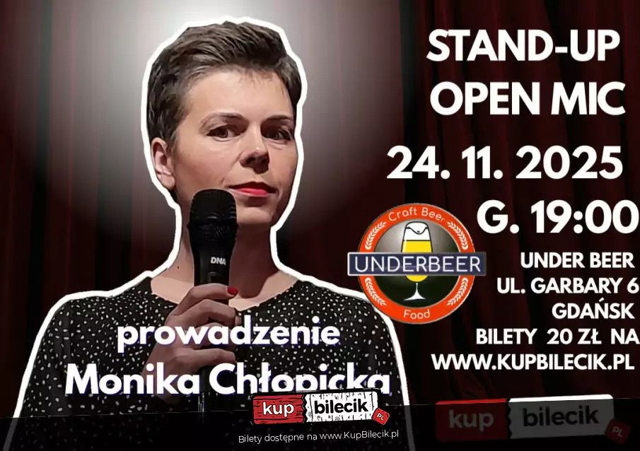 | Open mic w Under Beerdodano 2025-11-07 11:14:58 Zapraszamy na pierwszy open mic w Under Beer po wakacjach. Wystąpią komicy z Trójmiasta, którzy będą testować swoje żarty. Wydarzenie poprowadzi Monika Chłopicka - stand-up"erka z Gdańska, na scenie od ponad 3 lat, szczęśliwa mężatka, której życie nie rozpieszcza, za to ona chce innych rozpieszczać dystansem do życia. Kobieta z bagażem tak różnorodnych doświadczeń, że do końca życia będzie miała z czego żartować. Była już zakonnicą, matką, żoną i rozwódką, przedszkolanką, terapeutką autystów, rękodzielniczką, a teraz wymyśliła sobie, że będzie komiczką. W lokalu jest pyszne jedzonko i napoje. Lokal jest otwarty dłużej, więc można zostać po występie, by skorzystać z menu baru i restauracji lub przyjść przed wydarzeniem. Więcej informacji na social mediach. * 18+ Występ tylko dla widzów pełnoletnich. * Nagrywanie występu w formie audio i wideo jest zabronione. * Osoby nietrzeźwe i przeszkadzające będą wypraszane bez możliwości ubiegania się zwrotu za bilet. * Handel biletami w celu zysku jest przestępstwem (Art. 133 kw). Bilety do nabycia na: KupBilecik.plStand-up: Monika Chłopicka artyści: Monika ChłopickaMonika Chłopicka - stand-up"erka z Gdańska, na scenie od ponad półtora roku, szczęśliwa mężatka, której życie nie rozpieszcza, za to ona chce innych rozpieszczać dystansem do życia. Kobieta z bagażem tak różnorodnych doświadczeń, że do końca życia będzie miała z czego żartować. Była już zakonnicą, matką, żoną i rozwódką, przedszkolanką, terapeutką autystów, rękodzielniczką, a teraz wymyśliła sobie, że będzie komiczką. Bilety do nabycia na: KupBilecik.pl |