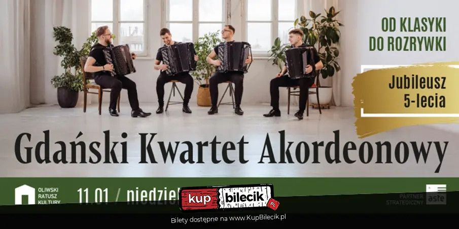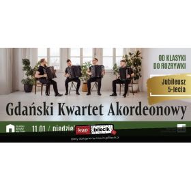 bilety: Oliwski Ratusz Kultury zaprasza na Jubileuszowy koncert Gdańskiego Kwartetu Akordeonowego pt. "Od klasyki do rozrywki" Serdecznie zapraszamy Państwa na koncert pt. Od klasyki do rozrywki. Program koncertu stanowi syntezę muzycznych zainteresowań członków zespołu. Na koncercie mile widziani będą zarówno melomani który słyszeli już zespól na żywo a także osoby dla których będzie to pierwsze spotkanie z Gdańskim Kwartetem Akordeonowym. Zespól przygotowuje na ten wieczór wiele muzycznych niespodzianek. Nie może Państwa zabraknąć z nami 11 stycznia 2026 w Oliwskim Ratuszu Kultury! Gdański Kwartet Akordeonowy po raz pierwszy wykona m.in. słynny Caravan D. Ellingtona czy fragmenty suity z baletu Dziadek do orzechów. Nie zabraknie również fragmentów Czterech Pór Roku Vivaldiego, słynnego Tańca węgierskiego nr 5 Brahmsa czy tang Astora Piazzolli. Bilety do nabycia na: KupBilecik.plGdański Kwartet Akordeonowy artyści: Paweł Wiśniewski, Paweł Ratajek, Wojciech Ulanowski, Maciej KacprzakAkordeon zachwyca potęgą brzmienia i fascynującą barwą muzyczną, jednak dopiero niedawno stał się ważnym instrumentem estradowym. Zespół czterech akordeonów to wyjątkowa moc i mnóstwo energii. Instrumenty te potrafią wspaniale bawić, ale bywają też poważne i rozdzierająco smutne. Zapraszamy na koncert o wyjątkowym programie: Gdański Kwartet Akordeonowy zagra wielkie i małe utwory w rozmaitych rytmach. Posłuchamy między innymi "Tańca węgierskiego" J. Brahmsa, tang Piazzoli czy "Tańca z szablami" A. Chaczaturiana. Bilety do nabycia na: KupBilecik.pl |