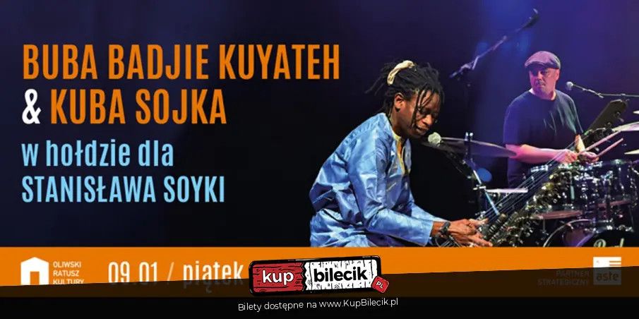 Oliwski Ratusz Kultury zaprasza na wyjątkowy koncert: Koncert Buba Badjie Kuyateh i gość specjalny: Kuba Sojka w hołdzie dla Stanisława Soyki. Stanisław Soyka i Buba Badjie Kuyateh tworzyli niezwykły duet, który narodził się z fascynacji Stanisława Soyki brzmieniem kory - afrykańskiej harfy. Jak sam pisał o projekcie z Bubą: "Od pierwszego spotkania poczuliśmy jakąś szczególną więź, nic o sobie nie wiedząc. Nie po raz pierwszy okazało się, że muzyka nie zna granic." Koncerty duetu to było wzajemne siebie słuchanie i improwizacja, a całość oparta na tradycyjnej muzyce z Gambii i kompozycjach obu artystów. Koncert Buba Badjie Kuyateh & Kuba Sojka jest hołdem dla Stanisława Soyki. Buba, wraz z gościem specjalnym - synem Artysty, znakomitym perkusistą Kubą Sojką - wykona kompozycje, które Soyka i Kuyateh prezentowali w duecie na korę i skrzypce. Połączenie brzmienia kory i perkusji niesie nową energię. Dodatkowo Kuba Sojka, przy akompaniamencie Buby, zagra i zaśpiewa parę utworów z repertuaru swojego ojca.