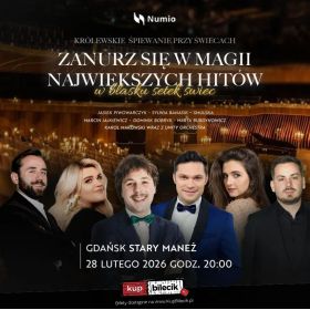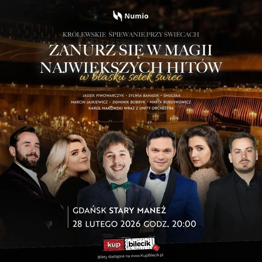 bilety: Niezapomniana noc muzyki, blasku świec i światowych hitów! Sylwia Banasik-Smulska, Marta Burdynowicz, Marcin Jajkiewicz, Dominik Bobryk i Jasiek Piwowarczyk - zwycięzca tegorocznej edycji The Voice of Poland, zapraszają Cię na wyjątkowy koncert, który zmieni Twój wieczór w magiczną przygodę. Królewskie Śpiewanie przy świecach artyści: Sylwia Banasik-Smulska, Marta Burdynowicz, Marcin Jajkiewicz, Dominik Bobryk, Jasiek PiwowarczykNiezapomniana noc muzyki, blasku świec i światowych hitów! Sylwia Banasik-Smulska, Marta Burdynowicz, Marcin Jajkiewicz, Dominik Bobryk i Jasiek Piwowarczyk - zwycięzca tegorocznej edycji The Voice of Poland, zapraszają Cię na wyjątkowy koncert, który zmieni Twój wieczór w magiczną przygodę. Pięcioro artystów międzynarodowej klasy, których głosy poruszają miliony serc, zaprezentuje światowe hity: "I Will Always Love You", "Shallow", "Simply the Best", "Skyfall" i wiele więcej. Doskonałą oprawę muzyczną zapewni Karol Makowski i Unity Orchestra - to będzie spektakl na poziomie największych światowych scen. Świece, dźwięki, emocje - wszystko co kochasz w jednym miejscu. Atmosfera, która zostanie z Tobą na zawsze. Bilety do nabycia na: KupBilecik.pl |