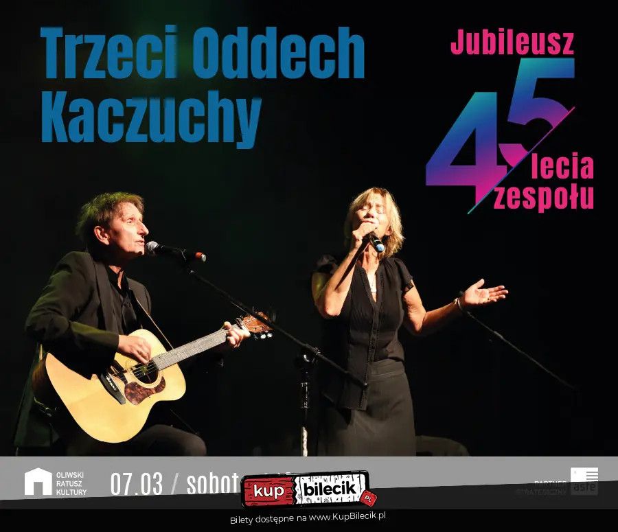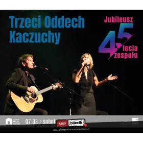 bilety: Oliwski Ratusz kultury zaprasza na Koncert Jubileuszowy - 45-lecie Trzeciego Oddechu Kaczuchy. Piosenki takie jak "Wódz", "Kombajnista", "Republika Rudych", "Pytania syna poety" czy "Nie umieraj nam inteligencjo" stały się nie tylko satyrycznym zapisem swojej epoki, ale także ponadczasową refleksją nad kondycją człowieka i społeczeństwa. Dziś zespół, w składzie Andrzej Janeczko i Maja Piwońska, niezmiennie koncertuje, zachowując świeżość przekazu i bliski kontakt z publicznością. Jubileuszowy koncert będzie muzycznym podsumowaniem 45 lat obecności na scenie - wieczorem pełnym wspomnień, humoru, wzruszeń i wspólnego świętowania. Bilety do nabycia na: KupBilecik.plTrzeci Oddech Kaczuchy artyści: Andrzej Janeczko, Maja PiwońskaZapraszamy na szczególny wieczór z autorem Andrzejem Janeczko i Maja Piwońską czyli z Trzecim Oddechem Kaczuchy, zespołem prowieniencji studenckiej. 40 lat temu zawojowali studencki festiwal w Krakowie i Festiwal w Opolu (I Nagroda w Konkursie Interpretacji). Zdobyli Grand Prix i 1 miejsce. Jaruzelski i stan wojenny przerwał ich byt publiczny na scenach Polski. Ich "Kombajnista", "Pytania syna poety" czy "Wódz" zniknął z radiowej anteny. Bojkot TV dopełnił reszty. Dopiero w latach 90-tych wrócili do telewizji. Z każdym rokiem z prześmiewczego kabaretu piosenki przeistaczali się w duet śpiewający literackie piosenki "Nie umieraj nam inteligencjo" czy "Życie jest". Ale nerw satyryczny pozostał. W recitalu zaśpiewają też pieśni zmuszające do uśmiechu. Maja Piwońska i Andrzej Janeczko przywiozą również z sobą swoją nową płytę "Życie jest" i książkę "Trzeci Oddech Kaczuchy, o życiu i scenie" wydaną przez Wydawnictwo Księży Młyn z Łodzi. Od 23 lat mieszkają na wsi pod Łodzią we wsi Ługi, gdzie Andrzej (autor tekstów i muzyk piosenek zespołu) już 12 rok jest Sołtysem. Jest grafikiem po ASP w Łodzi. 15 lat trzymali koniki polskie i mają zawsze dużo psów i kotów. W czerwcu 2018 roku, Ogólnopolska Komisja Historyczna Ruchu Studenckiego przyznała Andrzejowi Janeczce Nagrodę Honorową im. Andrzeja Potoka za działalność w klubach i teatrach studenckich Olsztyna oraz radiach studenckich i kabaretach, za nieprzerwaną działalność kabaretu Trzeci Oddech Kaczuchy założonego w 1981 roku, opisaną w książce "Trzeci Oddech Kaczuchy. O życiu i scenie", za przypominanie i utrwalanie wartości kultury studenckiej. Bilety do nabycia na: KupBilecik.pl |