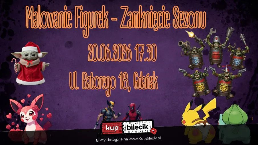 | Malowanie FIgurek - Zamknięcie Sezonudodano 2025-12-23 12:26:03 W tym sezonie mieliśmy sporo fajny figurek w skali 7cm do pomalowania! W ramach zamknięcia sezonu chcemy jeszcze raz z Wami pomalować i pokemony, i baby yoda, i catpoole! Zebraliśmy figurki z całego tego sezonu i właśnie 20.06.2026 będzie możliwość pomalowania tych figurek, które tak pokochaliście. Do wyboru będą walentynkowe pokemony, tyłeczki pokemonów, Baby Yoda świąteczny, Catpool i Catverine i wiele, wiele innych! Sam wybierzesz co chcesz malować! Malowanie Figurek artyści: WarsztatyMalowanie Figurek: Od Pierwszego Pociągnięcia po Arcydzieło! Gotowi, by zanurzyć się w świat miniaturowej sztuki i dać upust swojej kreatywności W naszym studio każdy znajdzie coś dla siebie - niezależnie od tego, czy pędzel trzymasz po raz pierwszy, czy jesteś już weteranem bitewnych dioram! Co najważniejsze, o wszystko zadbamy my! Organizator zapewnia wszelkie materiały do malowania oraz figurki - Ty przynosisz tylko dobry humor i chęć do zabawy! Warsztaty Podstawowe: Dla Początkujących Bohaterów Pędzla! Nigdy nie malowałeś figurek A może Twoje ostatnie dzieło to laurka dla babci w przedszkolu Idealnie! Na naszych warsztatach podstawowych wprowadzimy Cię w magiczny świat farb i detali. Krok po kroku pokażemy, jak tchnąć życie w miniaturowe postacie, a Ty wyjdziesz z własnym, dumnie pomalowanym dziełem. Zero stresu, maksimum frajdy i gwarantowane "wow!" od znajomych! Warsztaty Zaawansowane: Gdy Pędzel Staje się Przedłużeniem Duszy! Dla tych, którzy już nie boją się cieniowania, blendowania i technik NMM (Non-Metallic Metal - tak, to prawdziwa magia!). Jeśli czujesz, że Twoje figurki potrzebują "tego czegoś", a Ty chcesz podnieść swoje umiejętności na epicki poziom, te warsztaty są dla Ciebie! Będziemy eksplorować zaawansowane techniki, eksperymentować z kolorami i sprawiać, że Twoje miniatury będą wyglądać jak z okładki magazynu. Przygotuj się na wyzwania i satysfakcję z perfekcji! Okolicznościowe Malowanie Figurek: Świętuj z Pędzlem w Dłoni! Walentynki z figurką zakochanego gnoma Orktober z krwiożerczym orkiem A może świąteczny elf z brokatem U nas każda okazja jest dobra, by chwycić za pędzel! Organizujemy tematyczne sesje malarskie, które idealnie wpisują się w kalendarz świąt i nietypowych wydarzeń. To doskonały pomysł na oryginalne spędzenie czasu z przyjaciółmi, rodziną czy drugą połówką. Dużo śmiechu, unikalne figurki i niezapomniane wspomnienia gwarantowane! Dołącz do nas i odkryj swoją artystyczną stronę - pędzle czekają! Bilety do nabycia na: KupBilecik.pl |